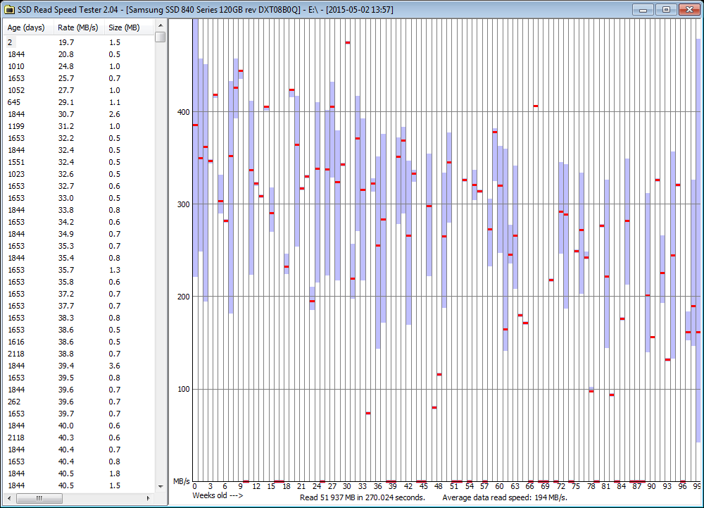 Delving deeper using the SSD Read Speed Tester tool developed by forum user Techie007 for the sole purpose of testing and visualizing the issue in the Samsung 840 drives, we get a graph of the performance of files in relation to how many weeks old they are. The graph includes all partitions because I mounted the recovery partition as a volume mount point under the main partition: