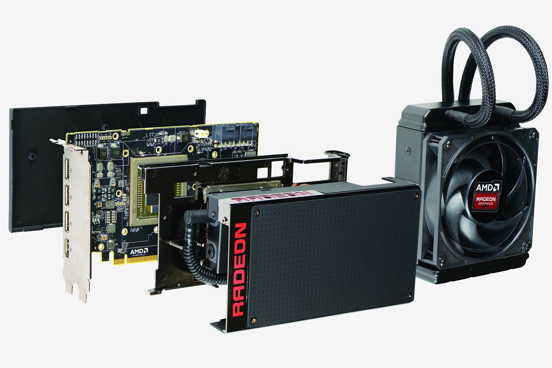 Of course while the PCB is compact, the cooling isn't. Dissipating at least 275 watts of power needs a serious cooler and instead of equipping a 13" long heatsink and fan combo, AMD looked to the R9 295X2 for inspiration.
