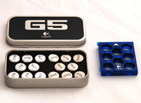 Logitech's second revision of the G5 gaming mouse adds a second thumb button on the left side as well as all-new aesthetics. A grippy, rubberized black and blue "cracked" surface replaces the smooth plastic of the previous G5. A DPI indicator lies on the top of the mouse between where your thumb and index finger rest. The rubberized scroll wheel is clickable and also tilts to the sides for two additional button clicks. Directly behind the scroll wheel are the DPI adjustment buttons to switch on-the-fly between 400, 800 and 2000 DPI at default settings.