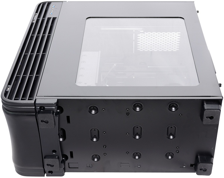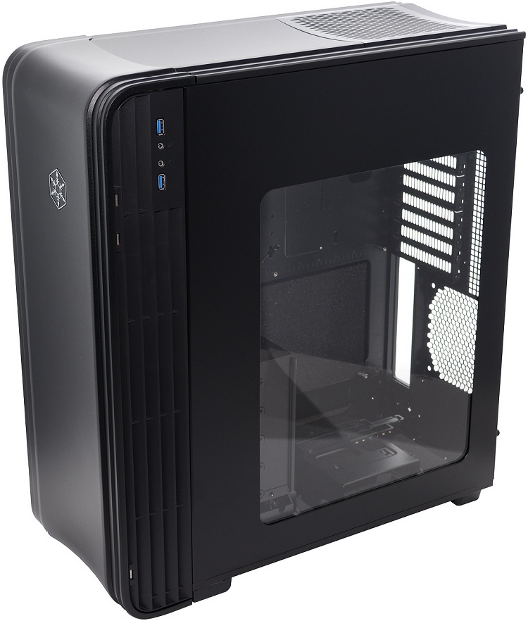 The opposite side vents are fixed to the case body and therefore remain attached to the body when the door is opened. This allows for easier access to the 5.25 drive bays as well as the removable dust filter. Additionally it has allowed Silverstone to install a small I/O panel at the top of the vents. This panel includes a pair of USB 3.0 ports along with two audio jacks.