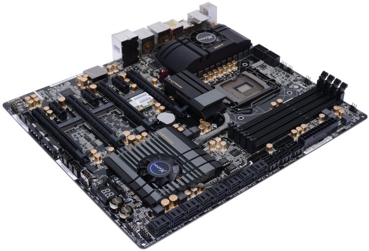 The board's PCI Express configuration seems like as good of a place as any to start and it features an ExpressLane PEX 8747 chip, which is a 48-lane, five-port, PCIe Gen 3 switch. The board has four PCIe x16 slots, though one bypasses the PEX 8747 and lets single-card setups connect directly to the CPU. Meanwhile, 3 and 4-way GPU configurations all receive x8 bandwidth.