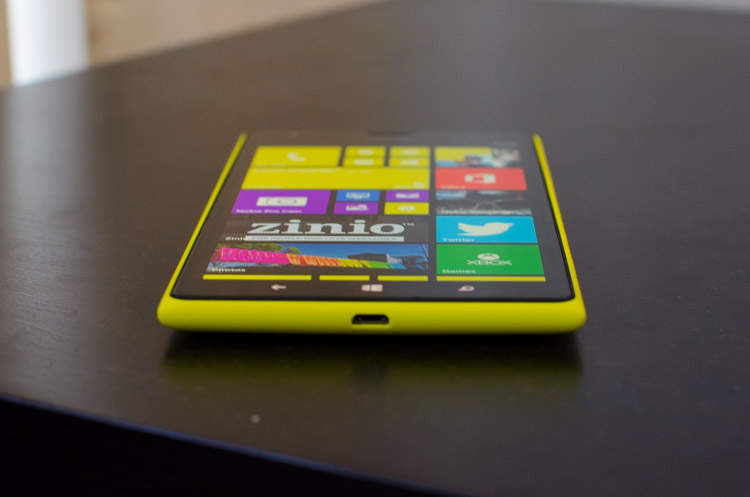 Around the device youll find the 3.5mm audio jack in the middle of the top edge, the microUSB port in the middle of the bottom edge, and the usual configuration of buttons on the right-hand side. The volume rocker sits at the top, followed by the power button, which is placed in a remarkably comfortable position considering the size of the Lumia 1520. Further down youll find the two-stage camera button, a staple inclusion on all Windows Phones that assists captures taken with the 20-megapixel rear shooter.
