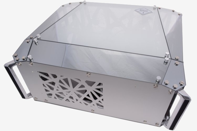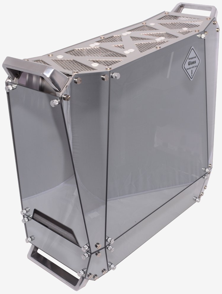 The outer panels are made up of 3mm-thick sheets of tempered glass finished with a semi-transparent reflective coating. This is the first time we have seen an entire case wrapped in this stuff and it's a pretty cool idea.