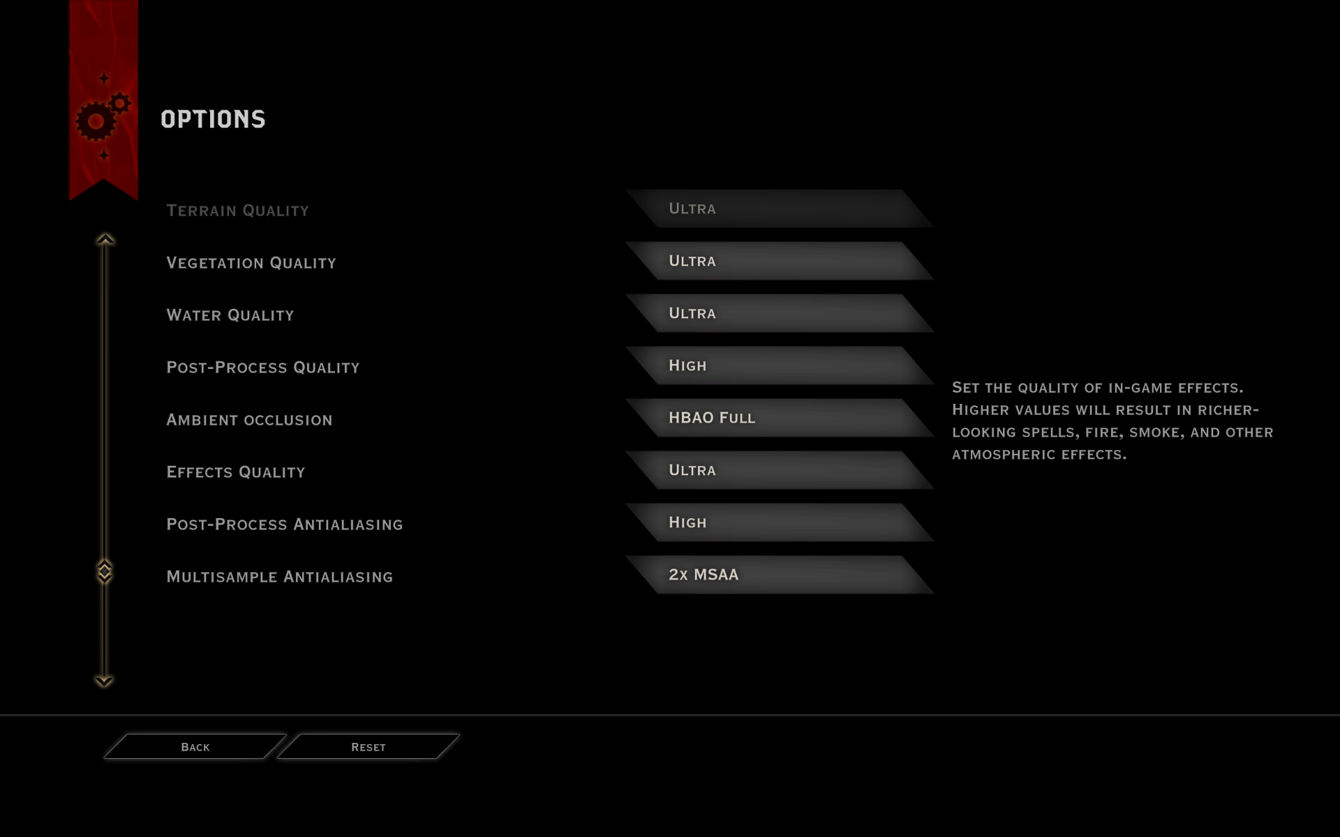 The Ultra quality preset was used which sets rendering features such as mesh, tessellation, texture, shadow, terrain, vegetation, water, post-process and effects to their maximum value. Meanwhile ambient occlusion is set to HBAO (horizon-based ambient occlusion) and multisampling anti-aliasing is set to 2xMSAA.
