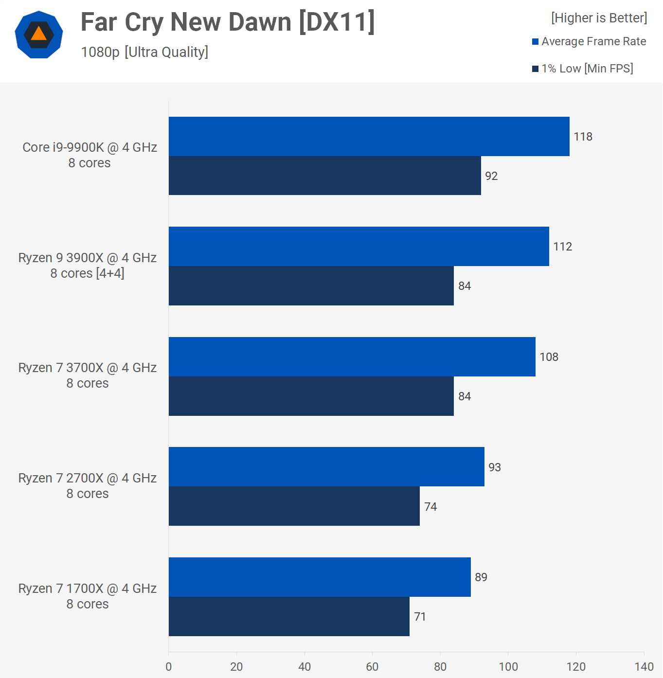 The 9900K also takes the first place in Far Cry New Dawn, beating the 3900X by a 5% margin for the average frame rate, and 10% for the 1% low result. This is while running at a frequency lower than out of the box.