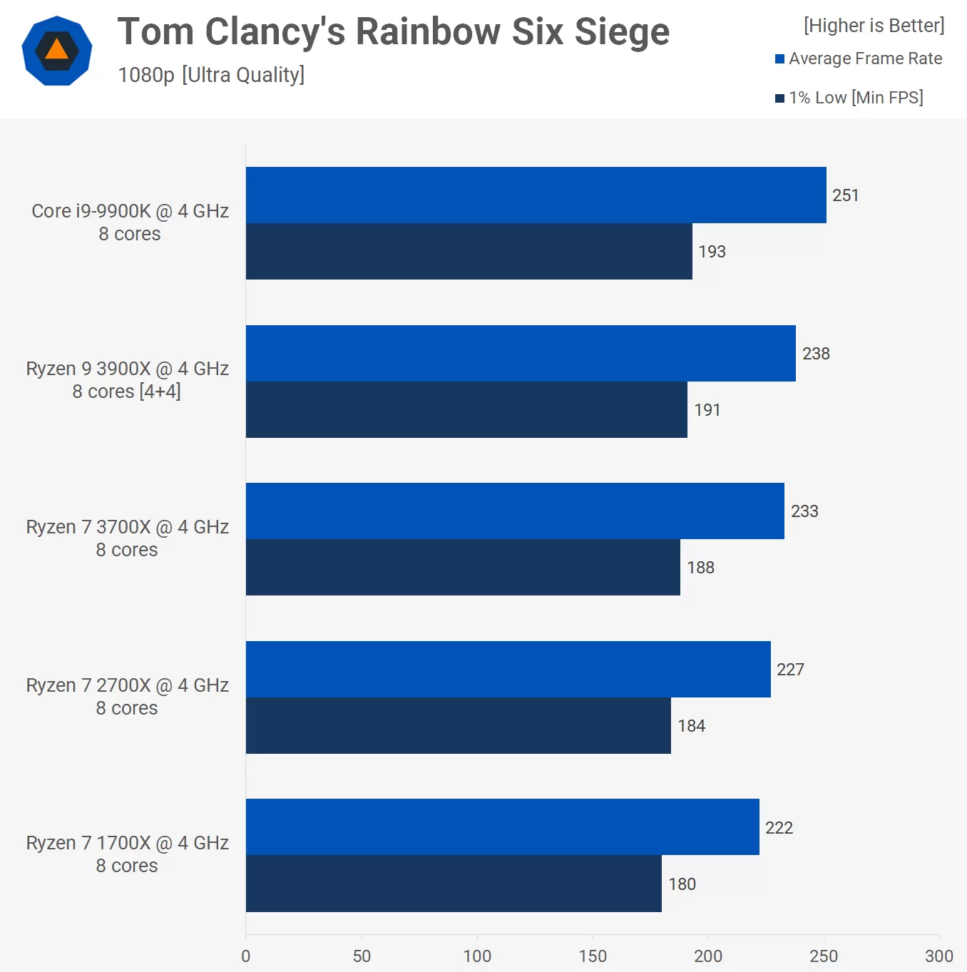 The last game we're looking at is Rainbow Six Siege. Even though this title is mostly GPU bound, we see the 9900K performing a good bit faster when looking at the average frame rate. 1% low performance was closer across the board.