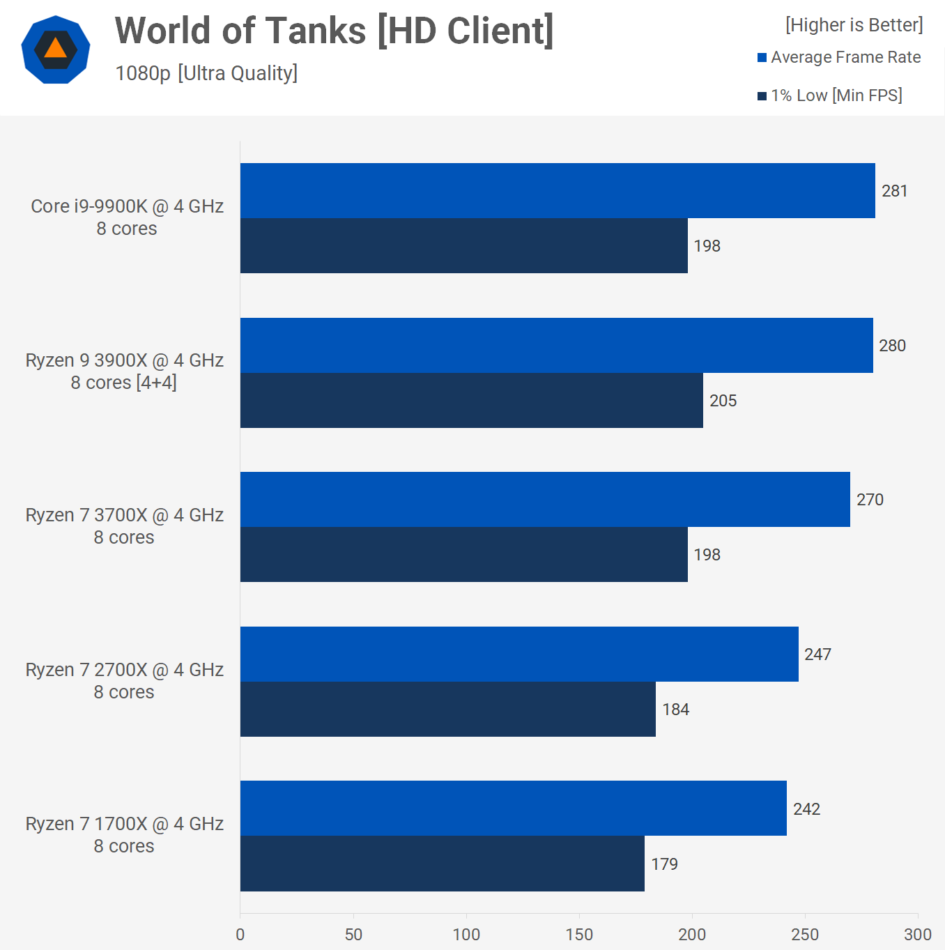 Another game we decided to check out was World of Tanks. This title was recently redesigned to take better advantage of multi-core CPUs. When matched at the same clock speed the 3900X provided marginally better 1% low performance than the 9900K, while average frame rates were about the same.