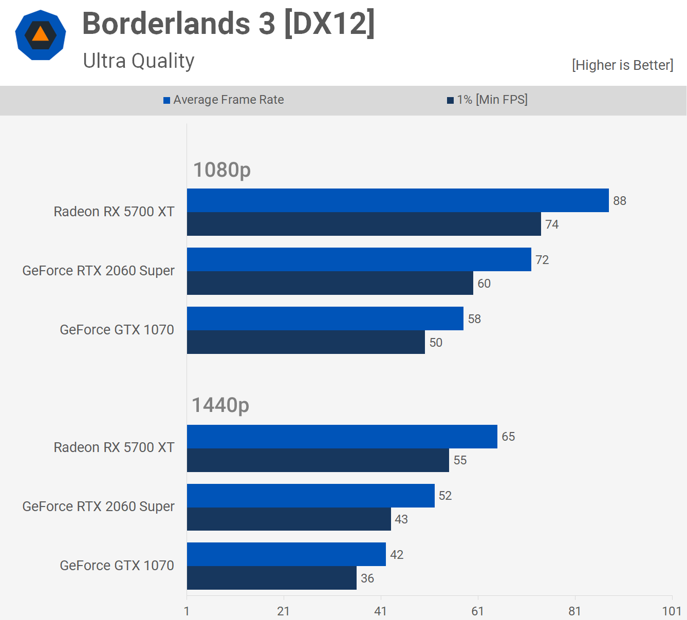 In Borderlands 3 the RTX 2060 Super was 24% faster than the GTX 1070, but the Radeon did much better with an impressive 55% improvement, averaging 65 fps opposed to just 42 fps. At 1440p the difference in performance is very noticeable.
