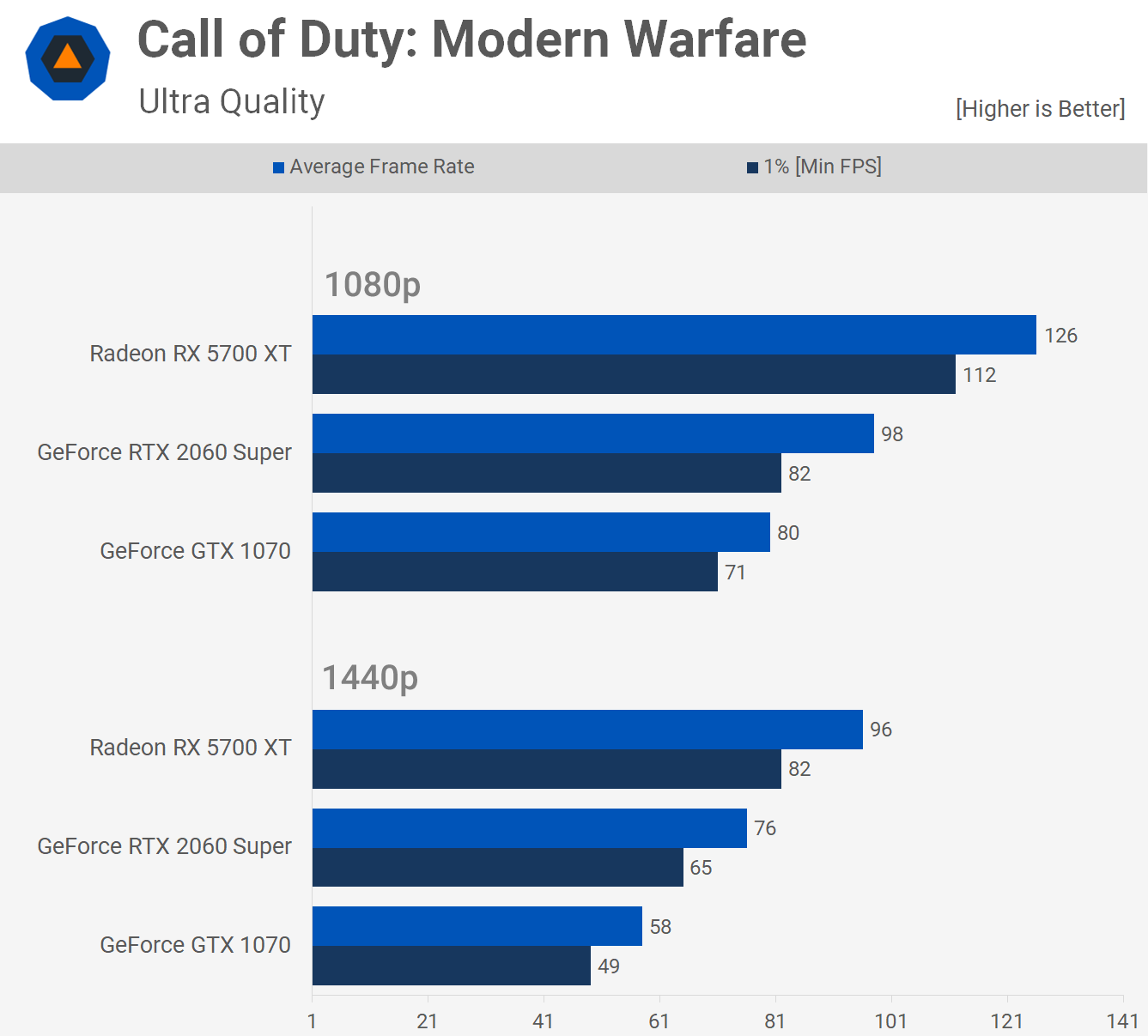The Radeon RX 5700 XT is a beast in Call of Duty: Modern Warfare, beating the RTX 2060 Super by a 26% margin at 1440p and that meant it was 66% faster than the GTX 1070. The 2060 Super was also 31% faster than the 1070 which isn't too bad.