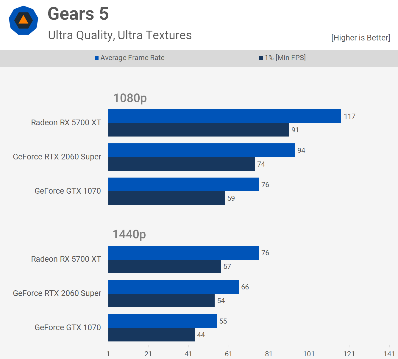 Surprisingly we see just a 20% performance boost for the 2060 Super over the 1070 when testing with Gears 5. That said, the 5700 XT beat the 1070 by a rather convincing 38% margin at 1440p and 54% at 1080p.