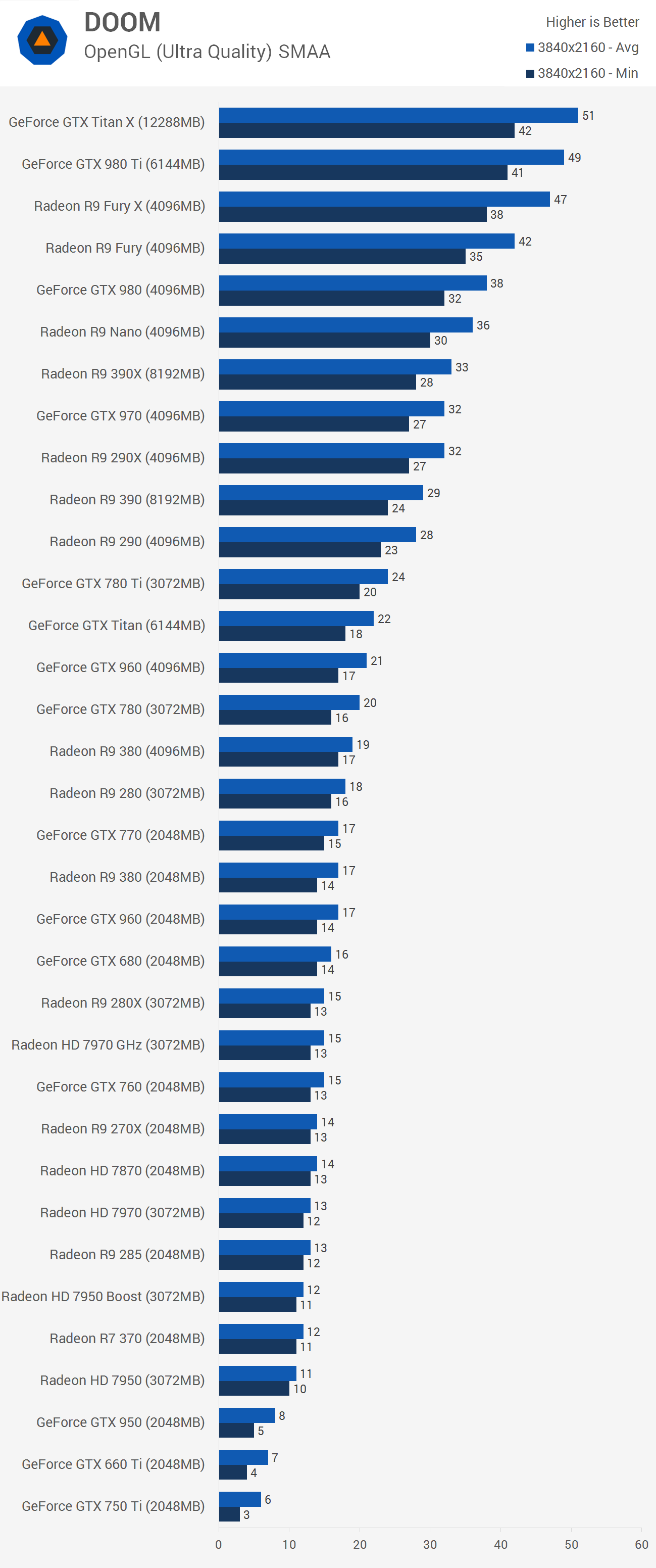 Not to be surprised, 4K performance is only possible on top tier cards such as the Titan X, 980 Ti and Fury X. Obviously the Titan X provided the best performance, though the difference between it and the 980 Ti was negligible. Still, with a minimum of 40fps and averages of around 50fps, serious gamers will ultimately want something a bit faster and since SLI doesn't work, the upcoming GTX 1080 might be the perfect solution.