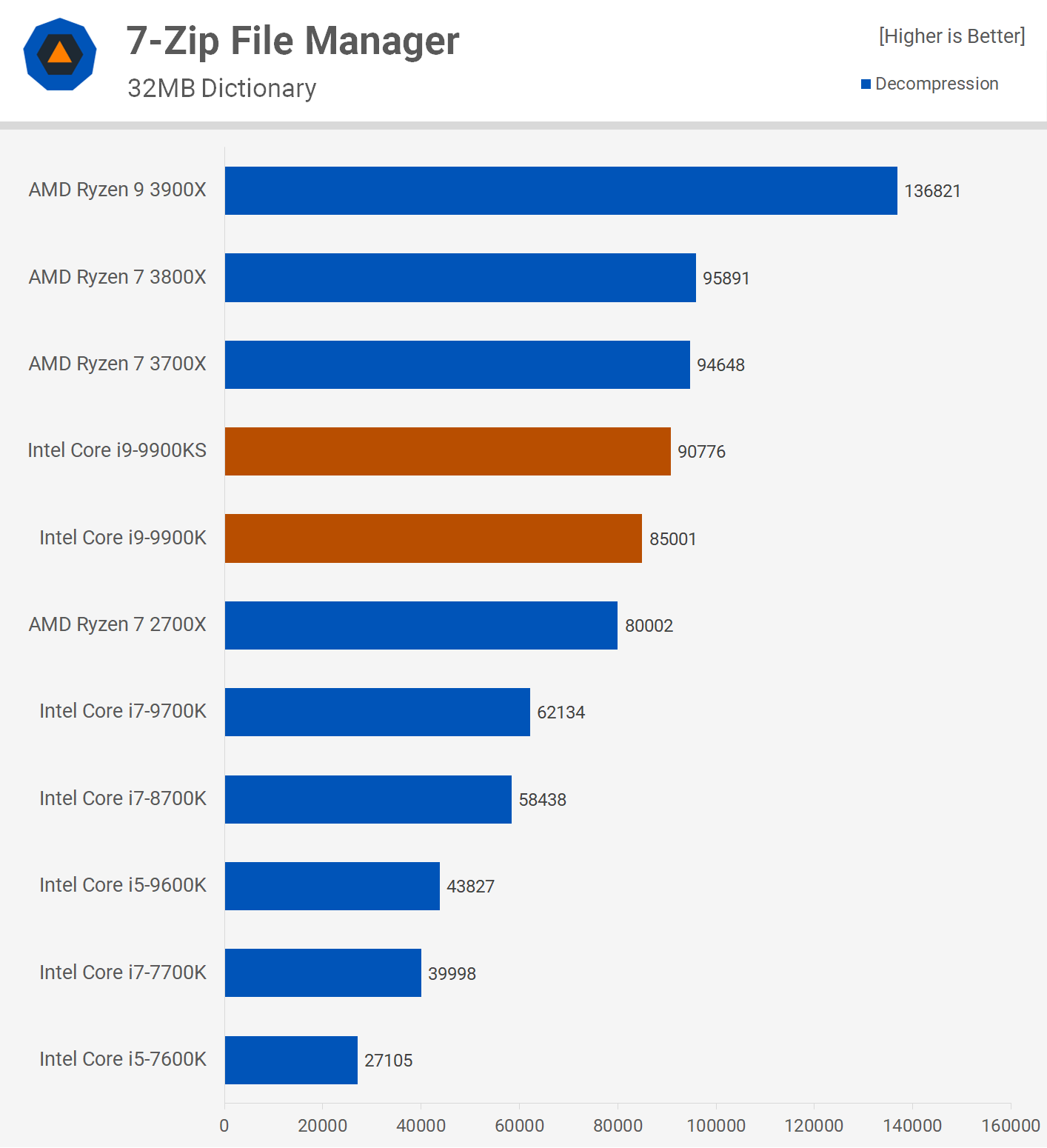 We see another insignificant performance gain for the 7-zip compression test. Though when measuring performance using the decompression test we did find that the 9900KS was 7% faster than the original 9900K, though that still makes it 5% slower than the 3800X.