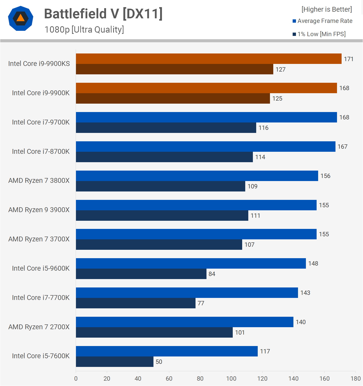 We see something similar in Battlefield V, though it's just a 2% boost. As expected the 9900KS is the fastest CPU in this title, but how well you'll notice the difference between 155 fps and 171 fps, we'll leave that up to you to decide.